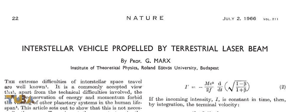 A kémiai és a nukleáris üzemanyagoknak jelzett korlátait Marx György korai, 1960-ban közölt számításaival már bizonyította. A lézersugárzás felfedezése késztette újabb megfontolásokra, amelyeket 1966-os cikkében tett közzé. A hagyományos meghajtással Föld körüli pályára állított űreszközön kifeszített  vitorlákkal” javasolta elnyelni a Földről nagyintenzitású lézerfénnyel közvetített erőlökést. Az űreszköz stabil hőmérsékletéhez az elnyelt energiát rendezetlen irányú hősugárzással hatékonyan szét kell szórni. Ez egyben a gyorsítást is optimalizálja, mivel a hősugárzással nem tud visszalökődést okozó impulzus távozni.