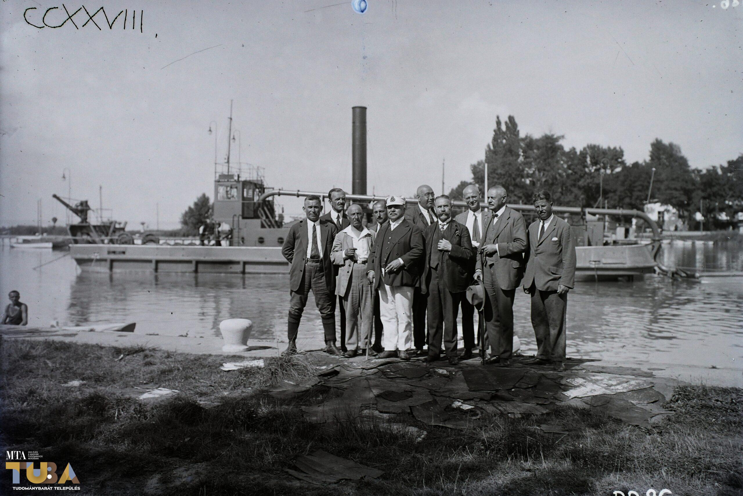 A Somogy (1928) dízelmotoros kotróhajó vízre bocsátás után a sólyatéri öbölben. Előtte a Földművelésügyi Minisztérium, a Székesfehérvári Kulturmérnöki Központ és az építést végző hajógyár képviselői. Középen fehér sapkában Kaáli Nagy Dezső, a Balatoni Kikötők Magyar Királyi Felügyelőségének vezetője