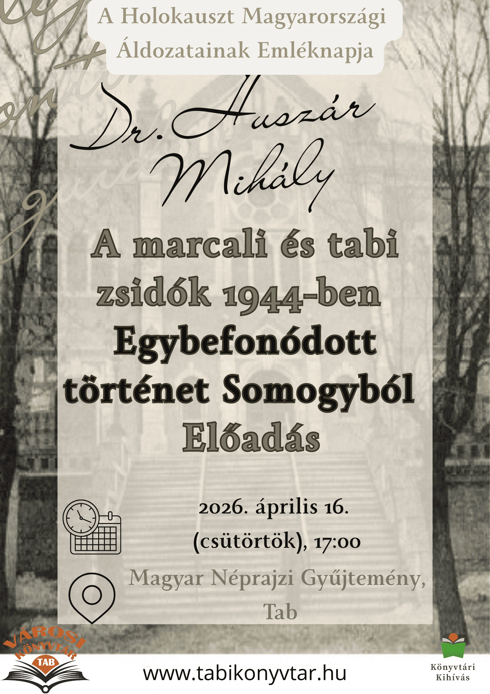 A somogyi zsidók két közösségének, a neológ irányultságú marcali és az ortodox irányultságú tabi történetében több közös pont volt. Milyen is volt az 1868-as egyetemes gyűlés képviselőválasztási küzdelme? Ki tervezte a 19. század végén a két település ikonikus épületeit? Milyenek voltak 1944 júniusában a tabi gettó mindennapjai? Milyen emlékezete maradt fenn a két városban a zsidó közösségnek? Az előadásban ezekről az összefonódásokról lesz szó.