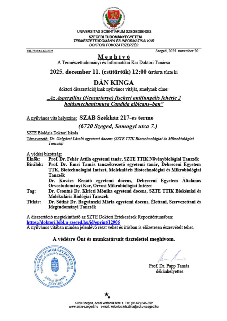 Dán Kinga PhD védése Az Aspergillus (Neosartorya) fischeri antifungális fehérje 2 hatásmechanizmusa Candida albicans-ban címmel