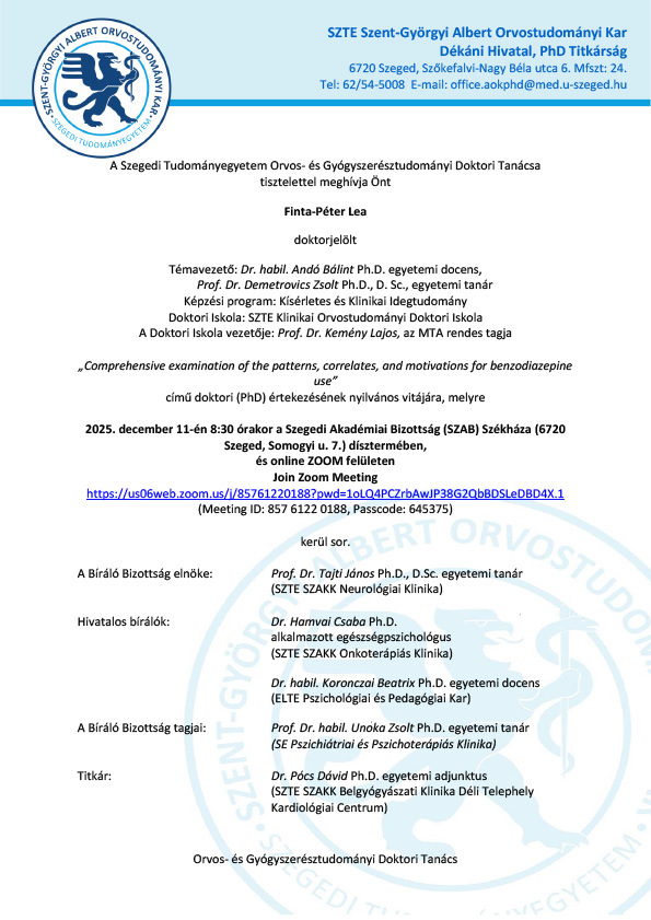 Finta-Péter Lea PhD védése Comprehensive examination of the patterns, correlates, and motivations for benzodiazepine use címmel