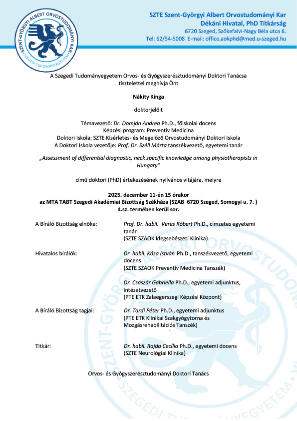 Nákity Kinga PhD védése Assessment of differential diagnostic, neck specific knowledge among physiotherapists in Hungary címmel