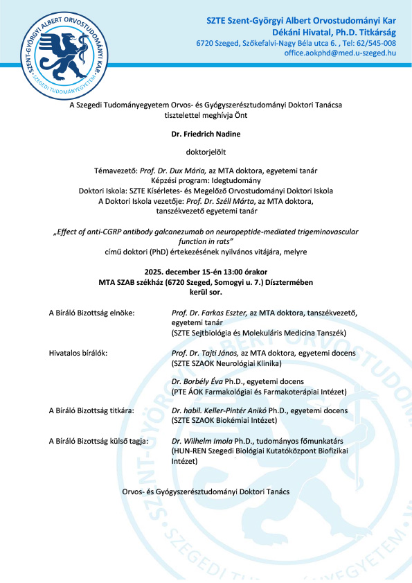 Dr. Friedrich Nadine PhD védése Effect of anti-CGRP antibody galcanezumab on neuropeptide-mediated trigeminovascular function in rats címmel