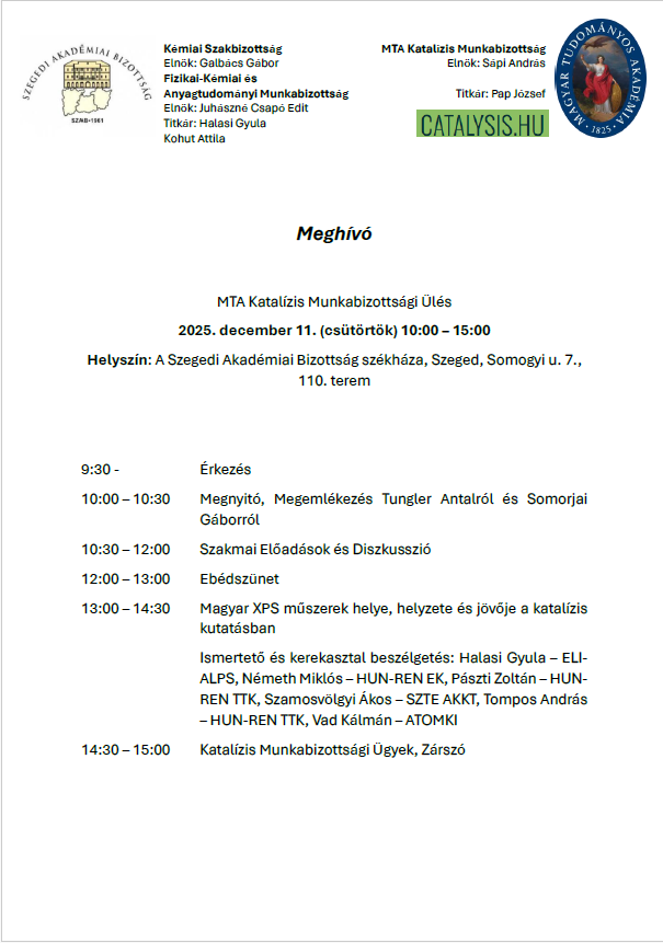 szervezi: SZAB Kémiai Szakbizottság Fizikai-Kémiai és Anyagtudományi Munkabizottság, MTA Katalízis Munkabizottság