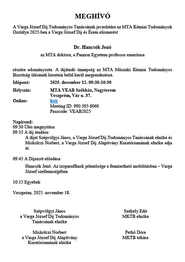 A Varga József Díj Tudományos Tanácsának javaslatára az MTA Kémiai Tudományok Osztálya 2025-ben a Varga József Díj és Érem elismerést Dr. Hancsók Jenő az MTA doktora, a Pannon Egyetem professor emeritusa részére adományozta.